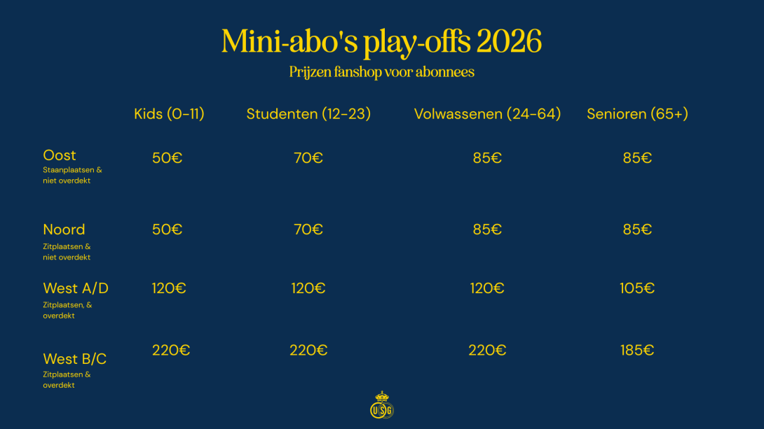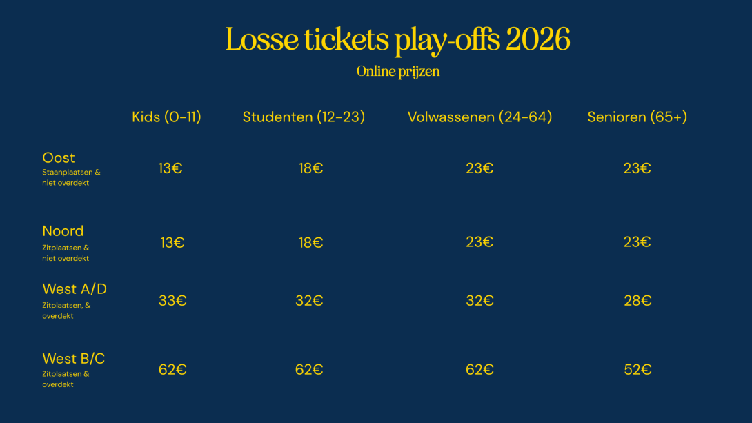 For the Champions’ Play-offs, our season ticket holders have one week, from 2 March at 11am until 9 March at 6pm, to renew their season ticket online. The fanshop at the Club House will be open from Monday to Wednesday from 1.30pm to 4.30pm and on Thursday and Friday from 11am to 6pm. Each season ticket holder will receive a match ticket for each of the five home matches, available in their online account.