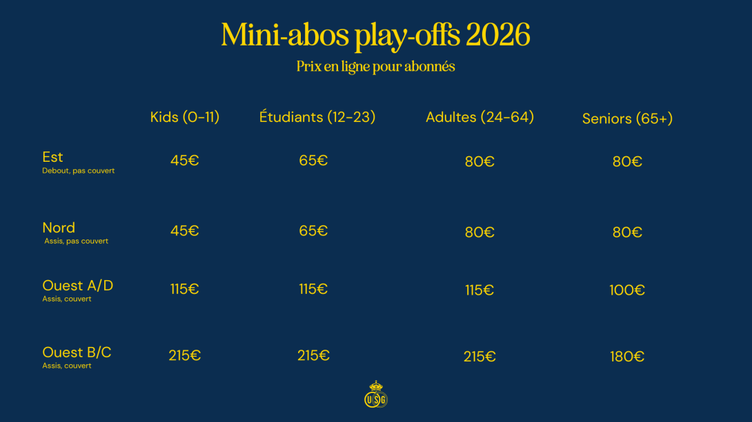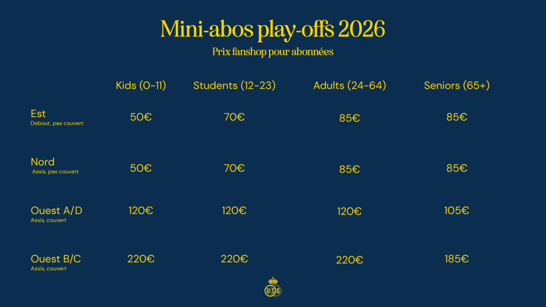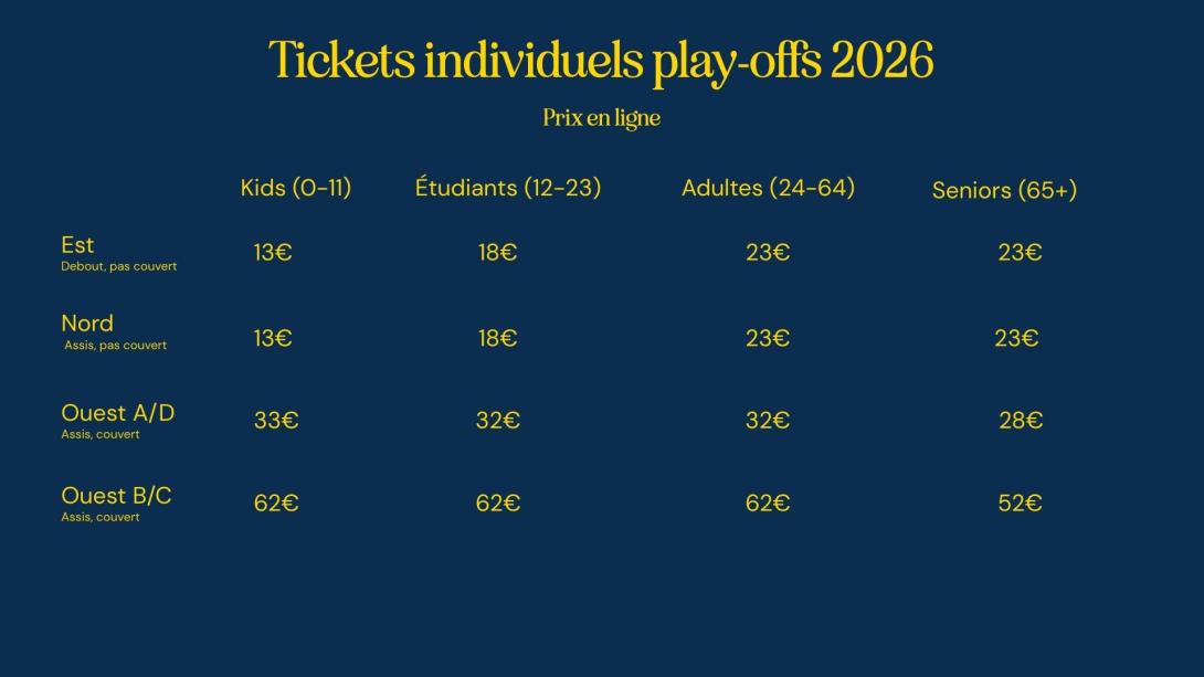 Pour les Champions’ Play-offs, nos abonnés disposent d’une semaine, du 2 mars à 11h au 9 mars à 18h, pour renouveler leur abonnement en ligne. Le fanshop au Club House sera ouvert du lundi au mercredi de 13h30 à 16h30 et le jeudi et le vendredi de 11h à 18h. Chaque abonné recevra un ticket match pour chacun des cinq matchs à domicile, disponible dans son compte en ligne.