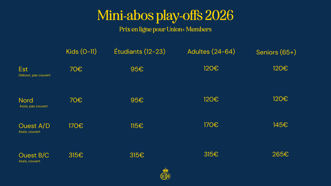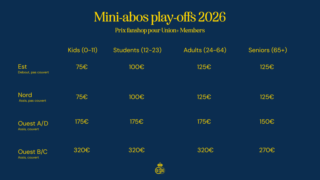 Nos Union+ Members bénéficient également d’une période de priorité pour acheter un ticketbundel pour les Champions’ Play offs au Stade Joseph Marien. Celle ci se déroule du 12 mars à 11h au 15 mars à 18h. Le fanshop sera ouvert les 12 et 13 mars de 11h à 18h.