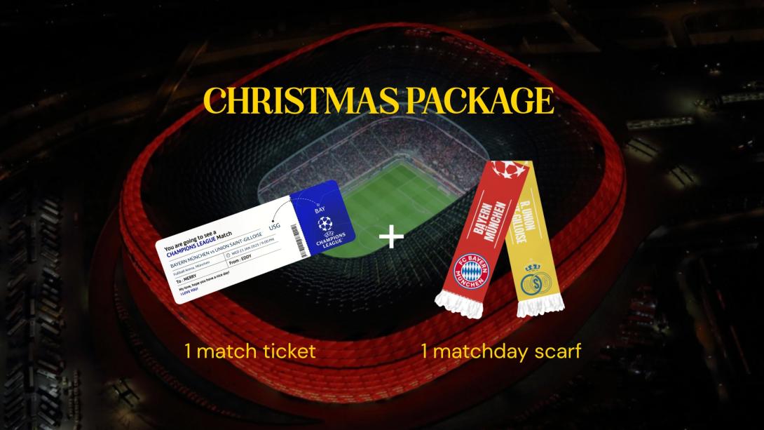 Le Munich Christmas Package comprend un ticket de match et une écharpe pour la rencontre Bayern Munich - Union. Le ticket (dans la tribune des visiteurs) et l’écharpe seront disponibles au cours du mois de janvier. Lors de votre achat, vous recevez un voucher et une carte que vous pouvez offrir le soir de Noël.