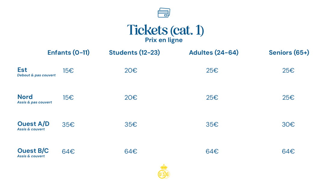 Vous pouvez acheter vos tickets sur ticketing.rusg.brussels ou dans notre fanshop les jeudis et vendredis entre 11h et 18h.